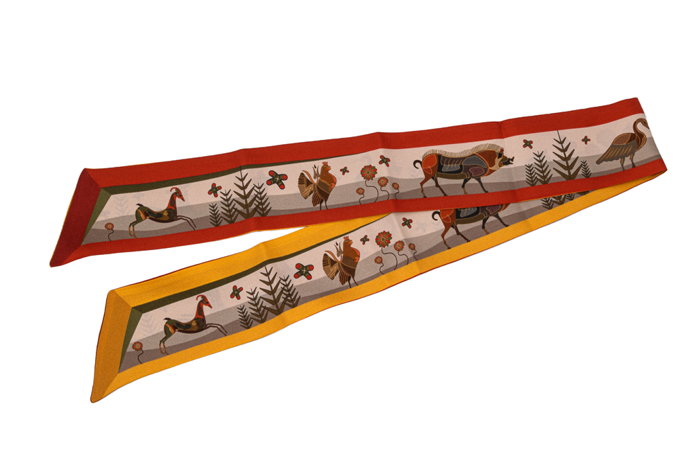 Μεταξωτή κορδέλα με μορφές ζώων, εμπνευσμένες από διάφορα εκθέματα του Μουσείου Ακρόπολης. Μεταξύ των μορφών διακρίνονται το άλογο, η κουκουβάγια, ένας κόκκορας, το φίδι, το ζαρκάδι, το ελάφι. Τιμή: 42,00 € - Σχεδιασμός: Κωνσταντίνος Χάλαρης