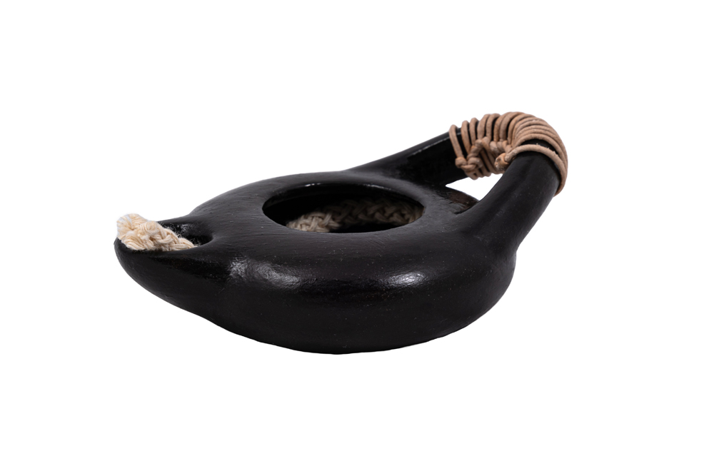 Μαύρο πήλινο λυχνάρι εμπνευσμένο από μονόμυξο μελαμβαφές λυχνάρι που βρέθηκε στις ανασκαφές της Ακρόπολης. Το πρωτότυπο (ακρ.5306) βρίσκεται στον 1ο όροφο του Μουσείου Ακρόπολης, προθ.32 αρ.9. Τιμή: μικρό μέγεθος 20,00 € | μεγάλο μέγεθος 30,00 € - Σχεδιασμός: Αττικό Φως