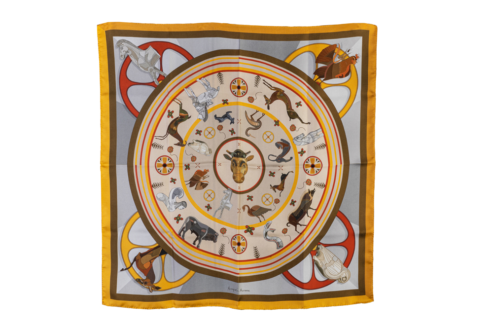 Τετράγωνο μεταξωτό μαντήλι με μορφές ζώων, εμπνευσμένες από διάφορα εκθέματα του Μουσείου Ακρόπολης. Μεταξύ των μορφών διακρίνονται το άλογο, η κουκουβάγια, ένας κόκκορας, το φίδι, το ζαρκάδι, το ελάφι. Τιμή: 75,00 € - Σχεδιασμός: Κωνσταντίνος Χάλαρης