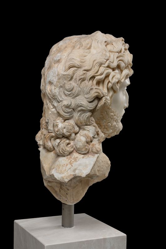 It was found in the Theatre of Dionysos in 1870 or 1876. At the back, the biggest part of his hair has been restored.