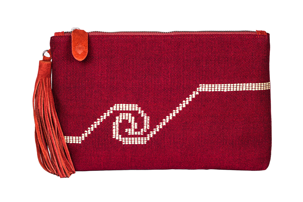 A red woven bag made of cotton with castor details. The design running along the length of the bag is made of plant-based silk, inspired by the patterns that decorate the garment of Kore 679, also known as the “Peplos Kore.” The statue of the Kore 679 is on display on the 1st floor of the Acropolis Museum, in the Archaic Acropolis Gallery. Price: 110.00 € - Design: Xenaki Anastasia