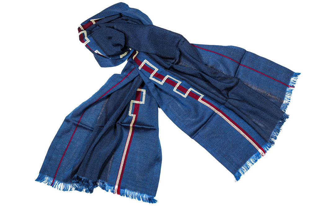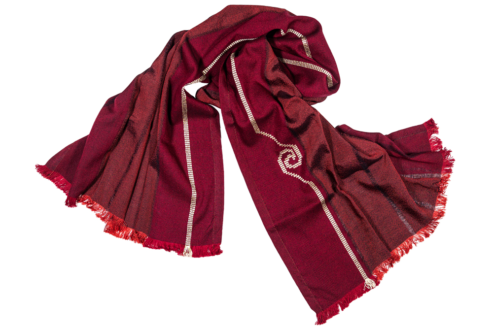 A red woven scarf made of cotton. The design running along the length of the scarf is made of plant-based silk, inspired by the patterns that decorate the garment of Kore 679, also known as the “Peplos Kore.” The statue of the Kore 679 is on display on the 1st floor of the Acropolis Museum, in the Archaic Acropolis Gallery. Price: 140.00 € - Design: Xenaki Anastasia