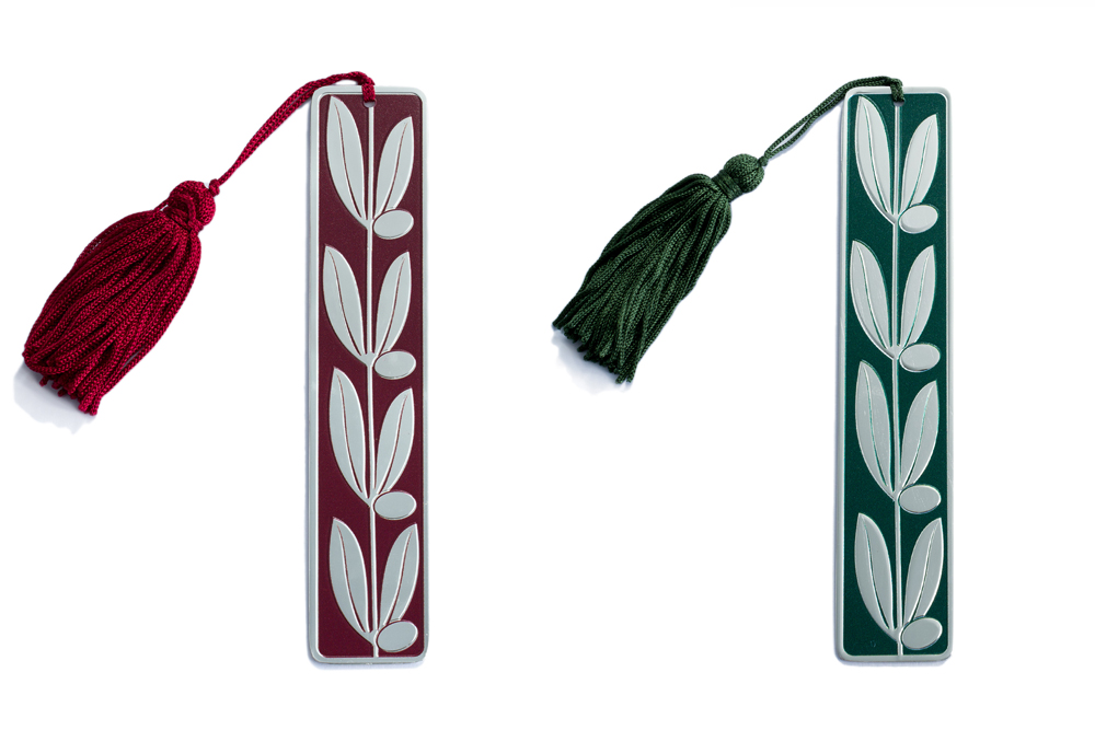 Silver bookmark with fabric tassel and laurel theme. The relief detail of laurel, on a red and green enamel background, is inspired by the laurel design depicted on the rim of the red-figure technique loutrophoros of 460-450 BC. The exhibit is located in the Gallery of the Acropolis Slopes, on the ground floor of the Acropolis Museum. (showcase 5, number 57). Price: 40.00 € - Design: Kostas Dimopoulos