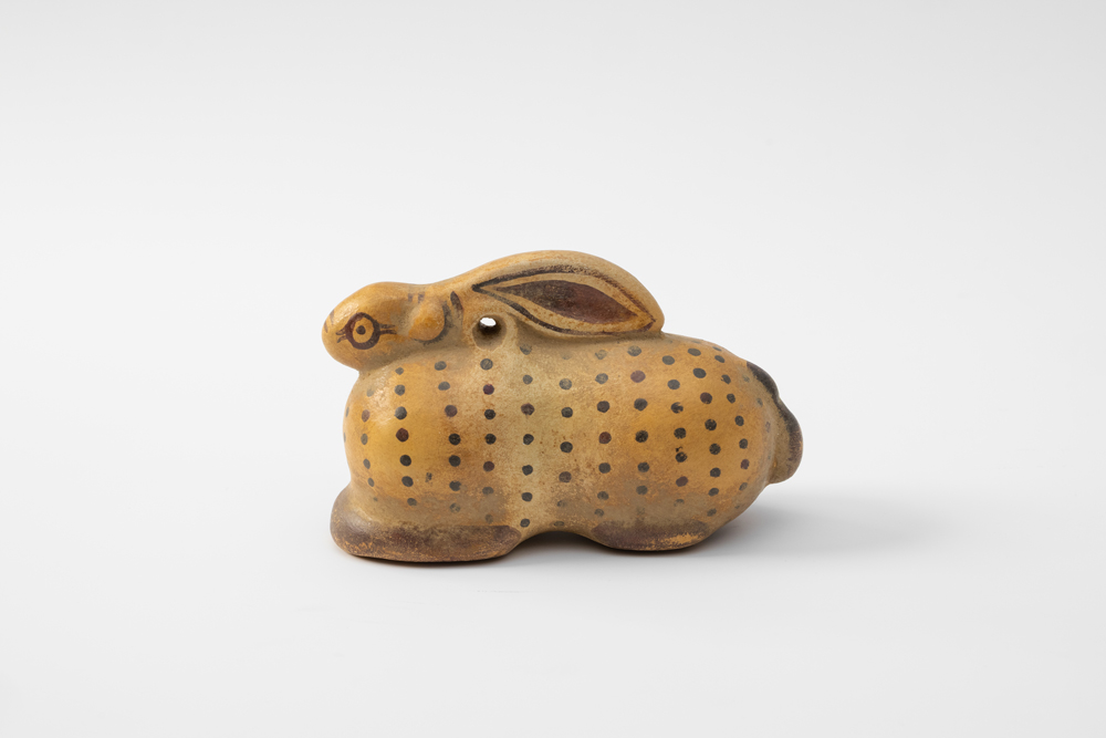 This ceramic rattle is a free rendering of an ancient vessel for perfumed oil in the form of a hare dating to the early 6th century BC. The hole below its ears was used for suspending the vessel with a string or rope. The ancient vessel can be seen at the Acropolis Museum when visiting the Gallery of the Acropolis Slopes on the ground floor of the Museum (Showcase 6, no. 134). Price: 26.00 € - Design: Antonis Palles
