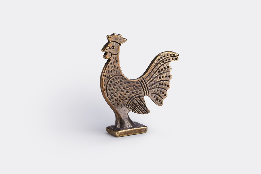 Bronze rooster inspired by a bronze cock figurine, an offering to the Sanctuary of the Acropolis, at the end of 6th century BC. The exhibit is at the first floor of the Acropolis Museum, Archaic Acropolis Gallery (showcase 20, no 17). Price: 9.00 € - Design: Antonis Palles