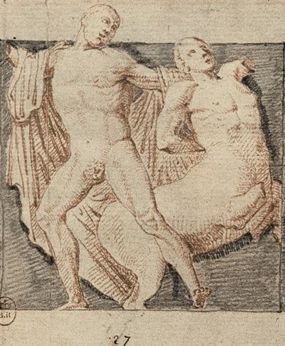 Plaster cast of metope 27 which is exhibited in the British Museum in London. A Lapith has grabbed a Centaur by the head, whom he has struck on the back with the spear in his right hand. The man’s himation hangs from his outstretched hands and frames his naked body. The wounded Centaur rears up and tries to remove the spear with his bended, right arm. Some scholars identify the young Lapith with Theseus, who participated in the battle supporting his friend Peirithoos. The heads of both figures have been lost.
