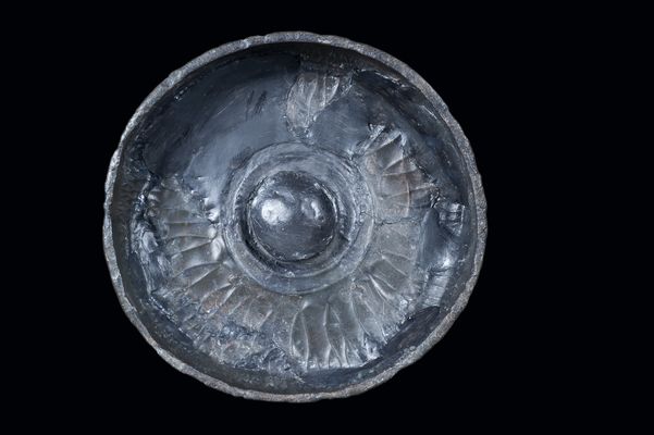 Ομφαλωτή φιάλη, συγκολλημένη και συμπληρωμένη. Η διακόσμηση έχει σφυρηλατηθεί από το εσωτερικό του αγγείου με αποτέλεσμα στην εξωτερική επιφάνεια να αποδίδεται ανάγλυφα. Απαρτίζεται από ακτινωτά φύλλα και πιθανόν άνθη λωτού. Κάτω από το χείλος, εξωτερικά, διαμορφώνεται ταινία με δικτυωτό κόσμημα που πλαισιώνεται από λεπτότερες ταινίες με στιγμές.